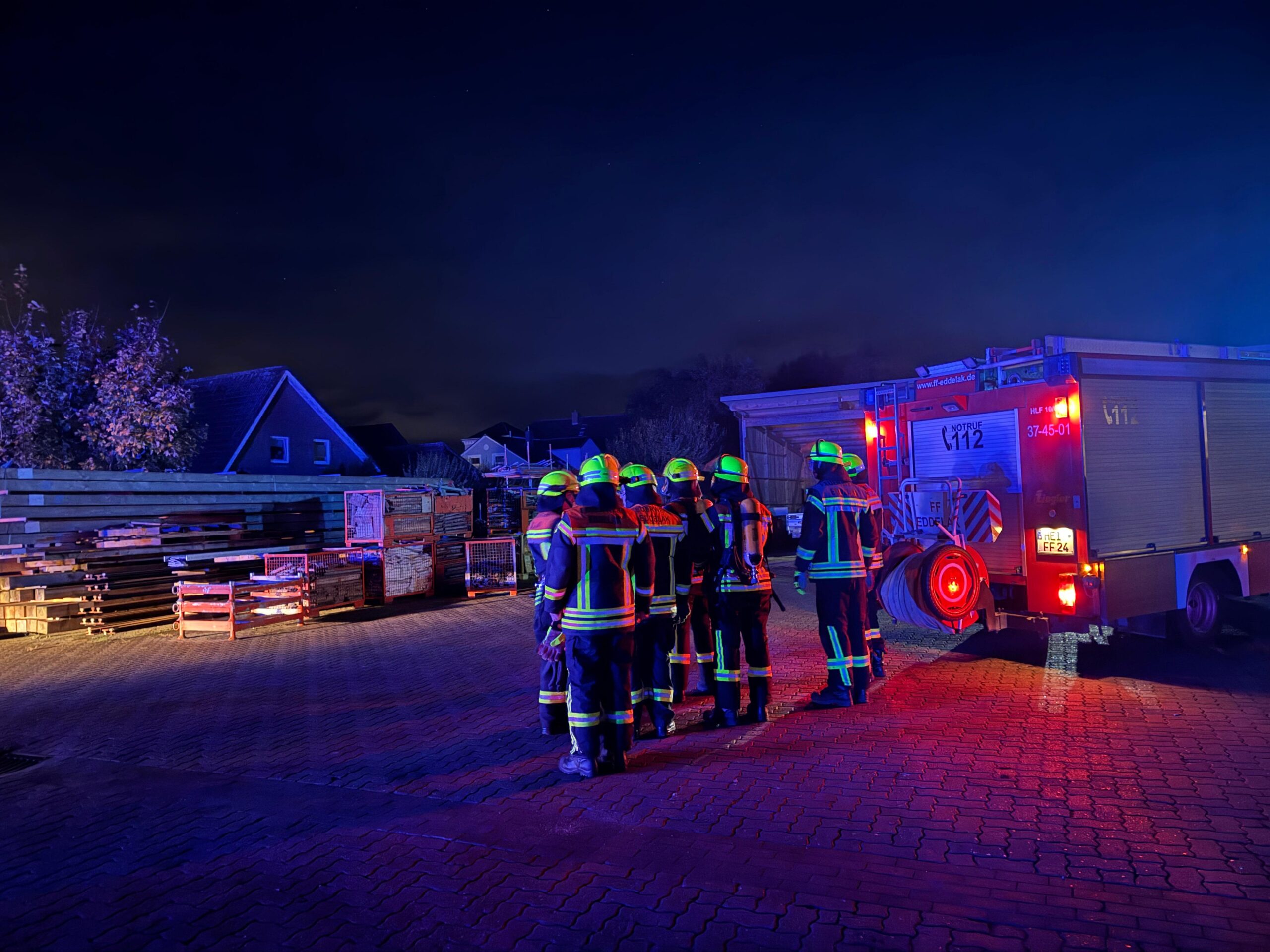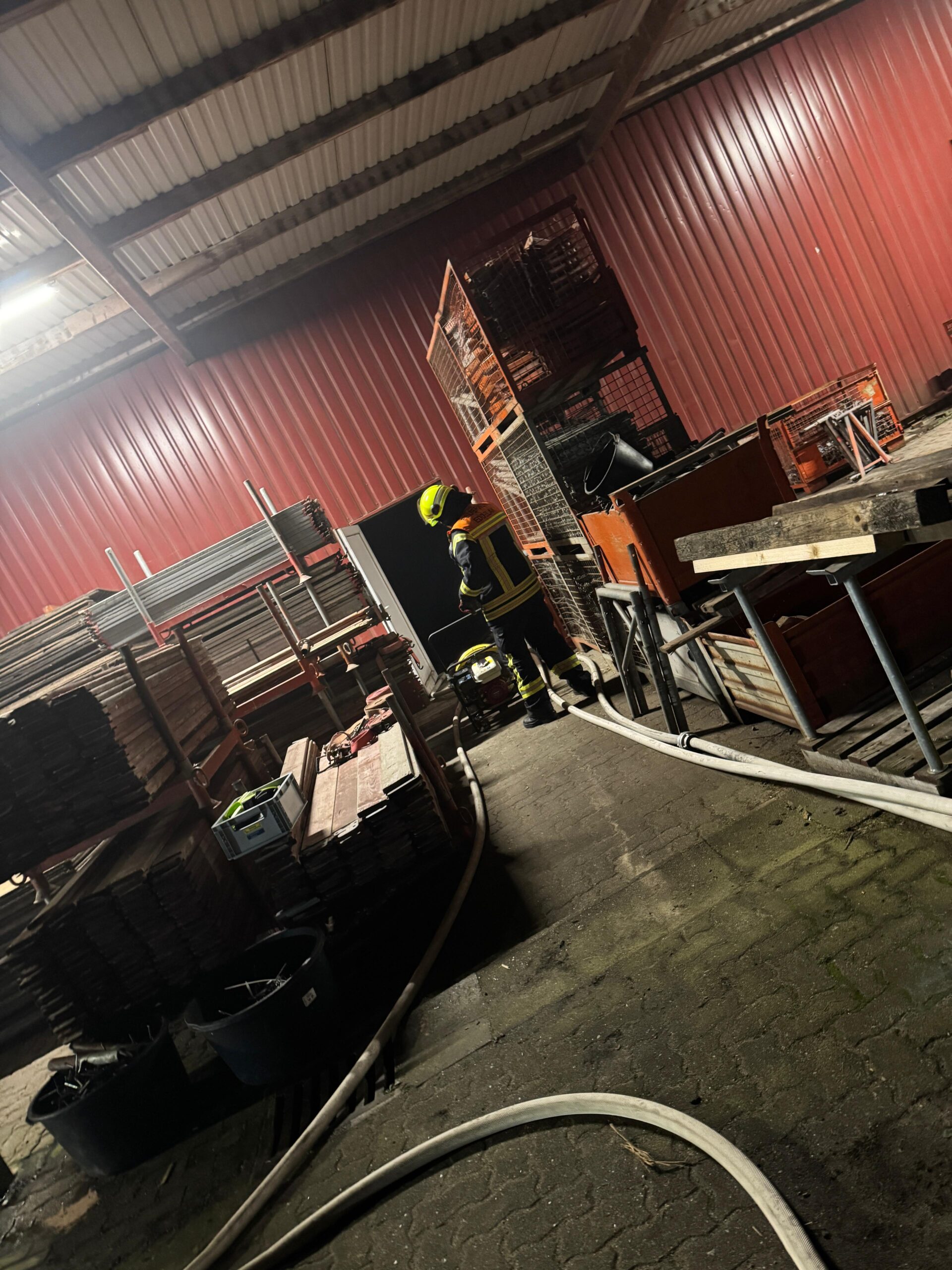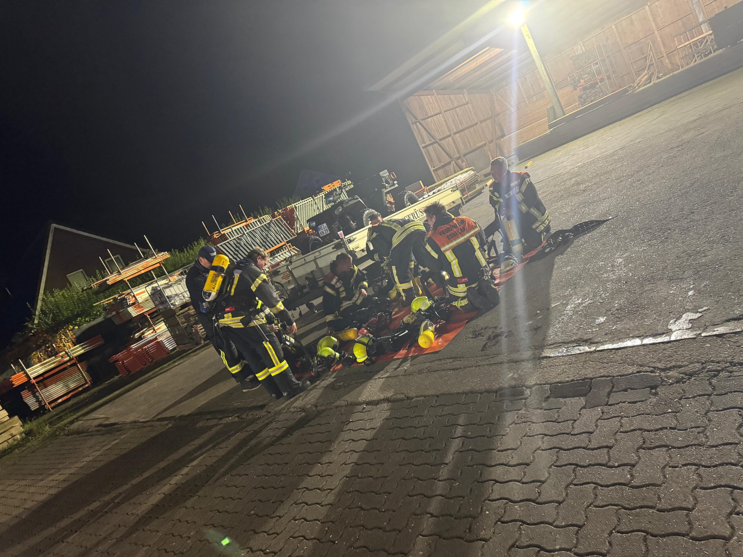 Mittwochabend, 19:30 Uhr – eigentlich stand der reguläre Zugdienst unserer Wehr auf dem Plan. Doch kaum hatte die Einweisung begonnen, ertönten plötzlich Sirene und Meldeempfänger. Die Einsatzkräfte rückten umgehend in die Bahnhofstraße zum Firmengelände von K&N Gerüstbau aus.