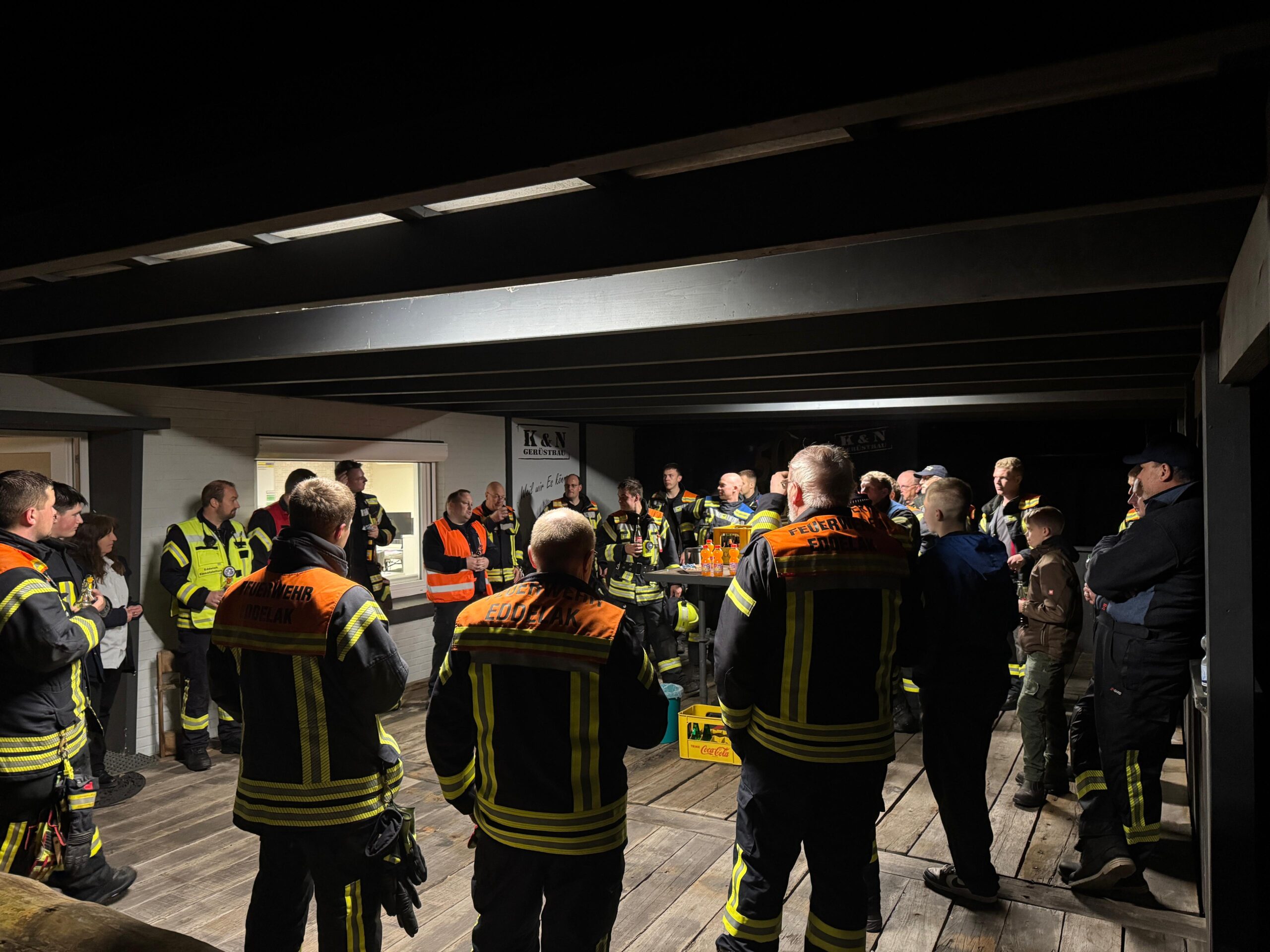 Im Anschluss fand eine gemeinsame Nachbesprechung statt, bei der die Übungsergebnisse reflektiert wurden. Die Firma K&N Gerüstbau versorgte die Einsatzkräfte dabei dankenswerterweise mit Getränken und kleinen Snacks.