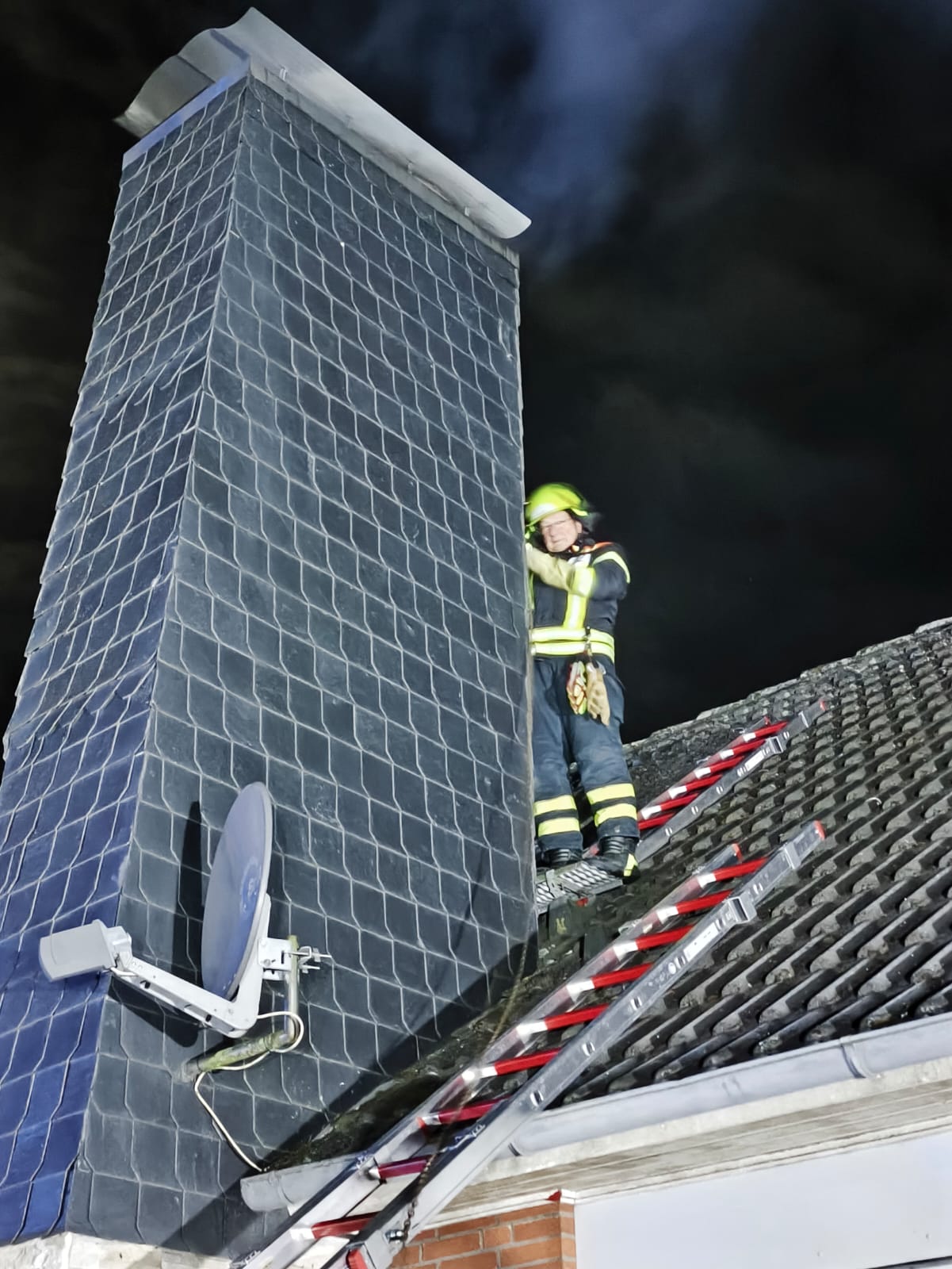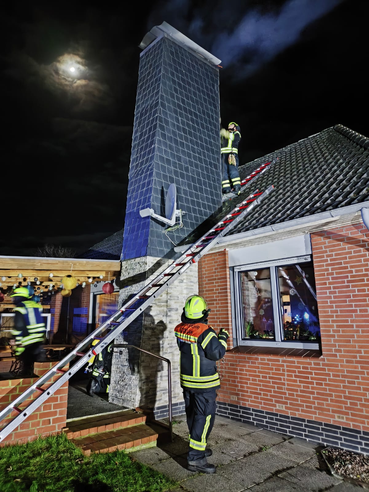 Eine besondere Rolle übernahm unser Feuerwehrmitglied Ralf Napiraski, der den Beruf des Schornsteinfegers erlernt hat und inzwischen im Ruhestand ist. Mit seiner großen Erfahrung konnte er bereits in der Anfangsphase wichtige Maßnahmen am Schornstein einleiten und die Einsatzkräfte fachkundig unterstützen.